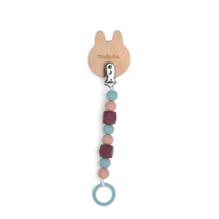 Attache-tétine lapin en bois et silicone pour ne plus perdre la sucette de bébé. S’attache facilement à tout support grâce à son clip ajustable. Les perles de silicone sont sans danger pour bébé, il pourra jouer avec et les mâchouiller.