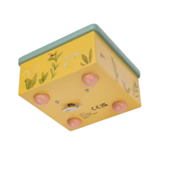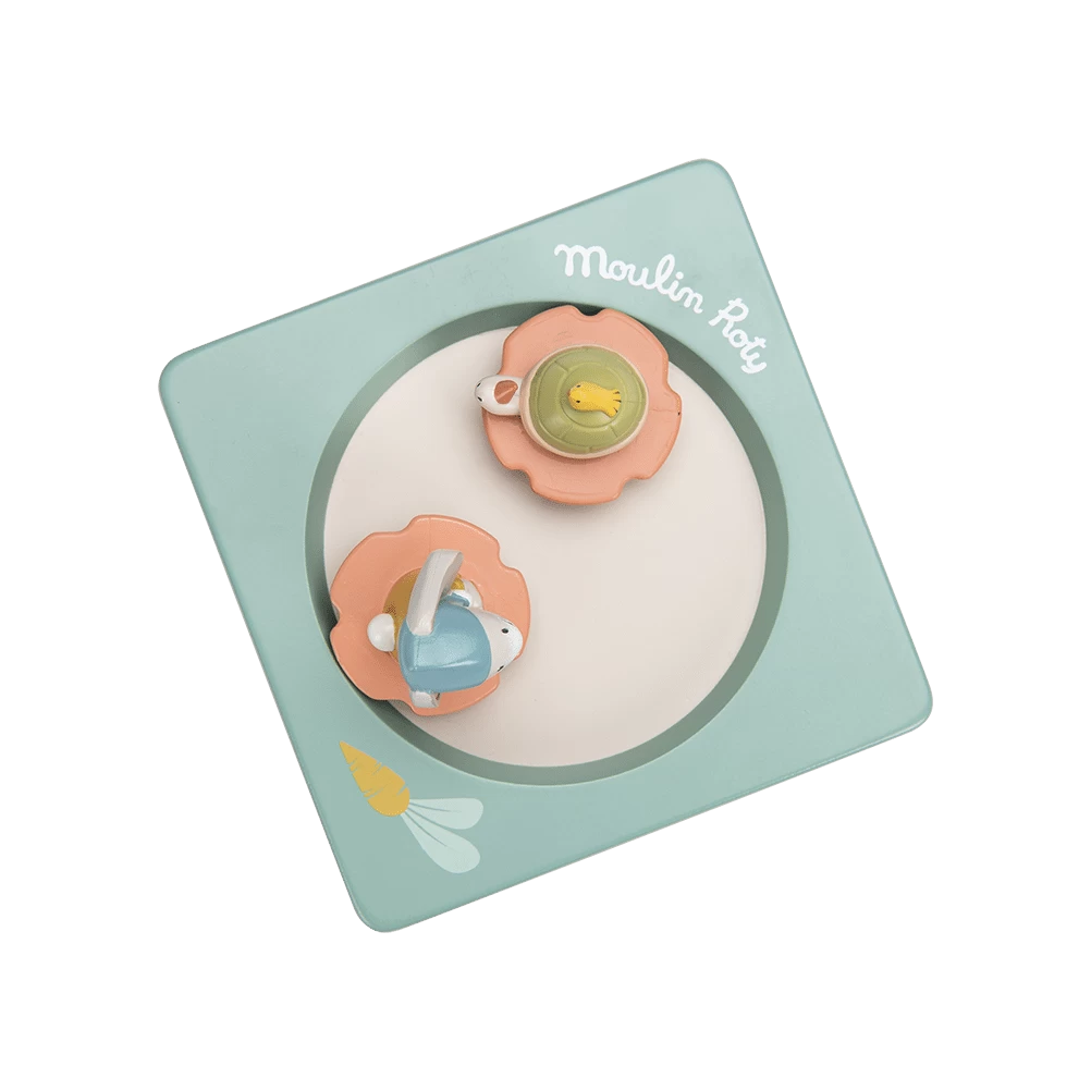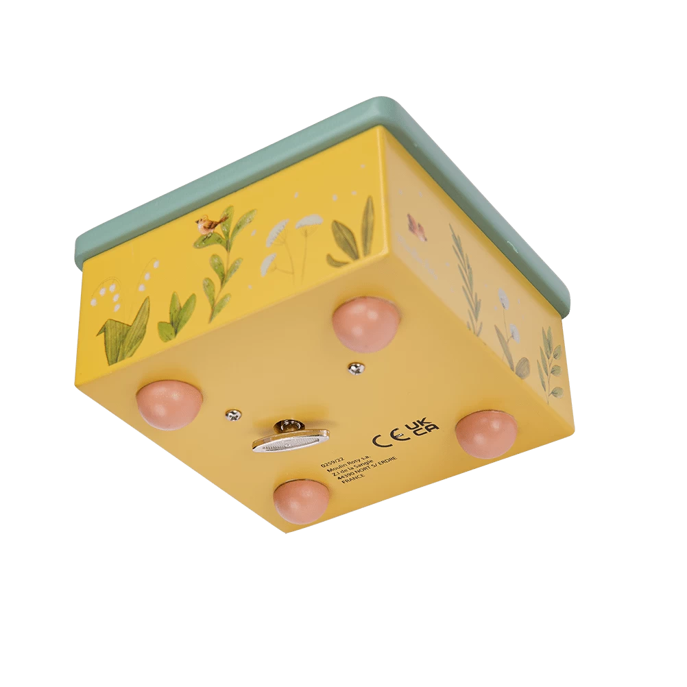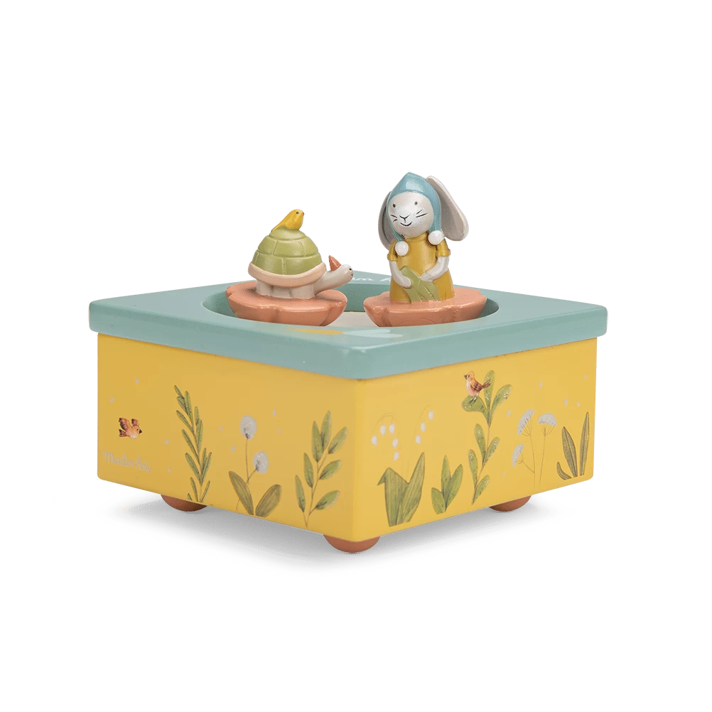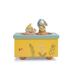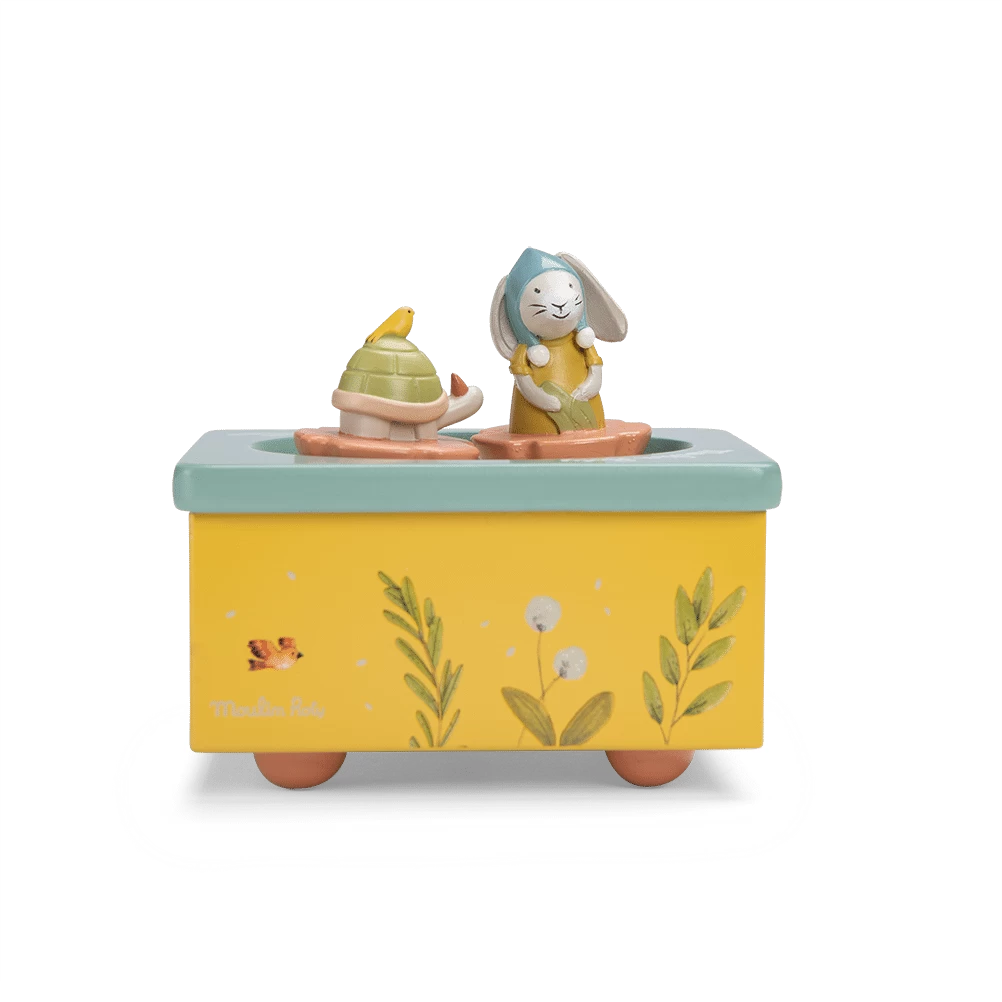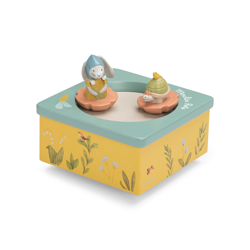 Boîte à musique aux couleurs de la gamme, illustrée d’un joyeux paysage composé de plantes, légumes et petits oiseaux du jardin. Le lapin et la tortue tournent et dansent sur la piste pour bercer et endormir bébé.