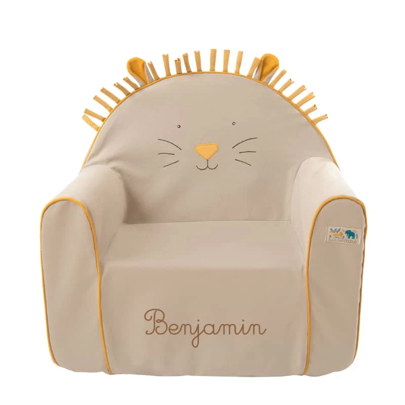 Un lion souriant, avec une belle crinière au milieu de laquelle s’assoir ! Cette chauffeuse en mousse, habillée d’une housse amovible et lavable, peut être brodée au prénom de l’enfant.