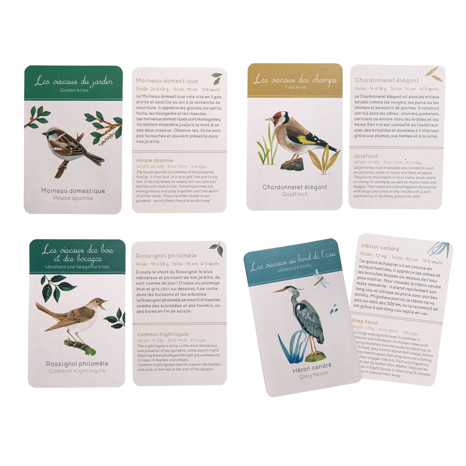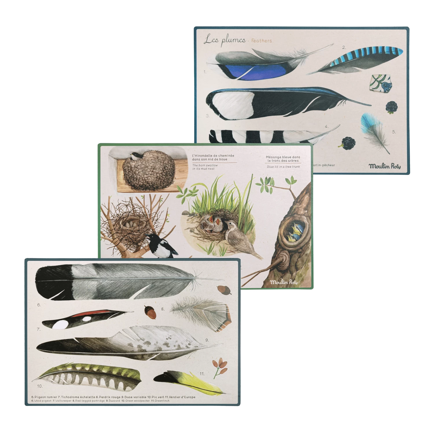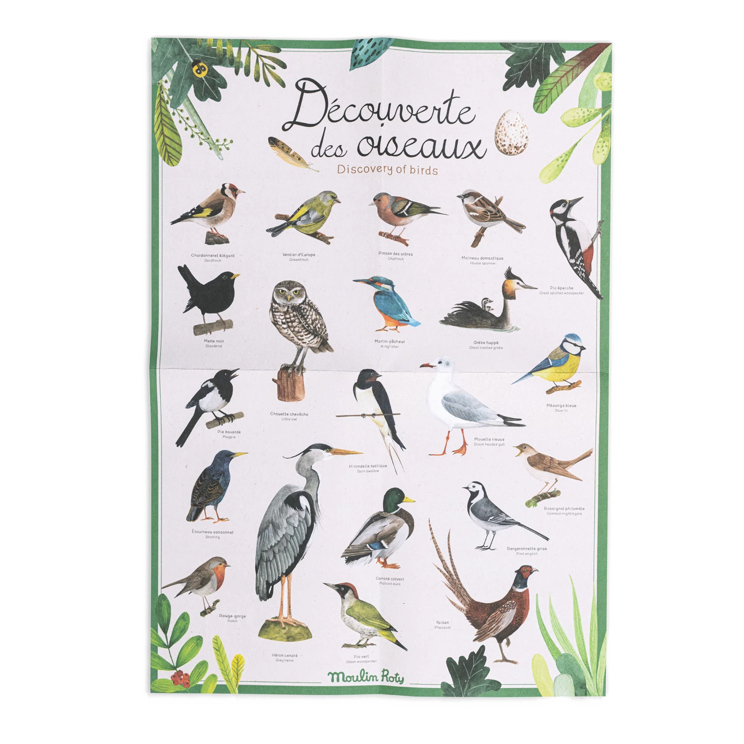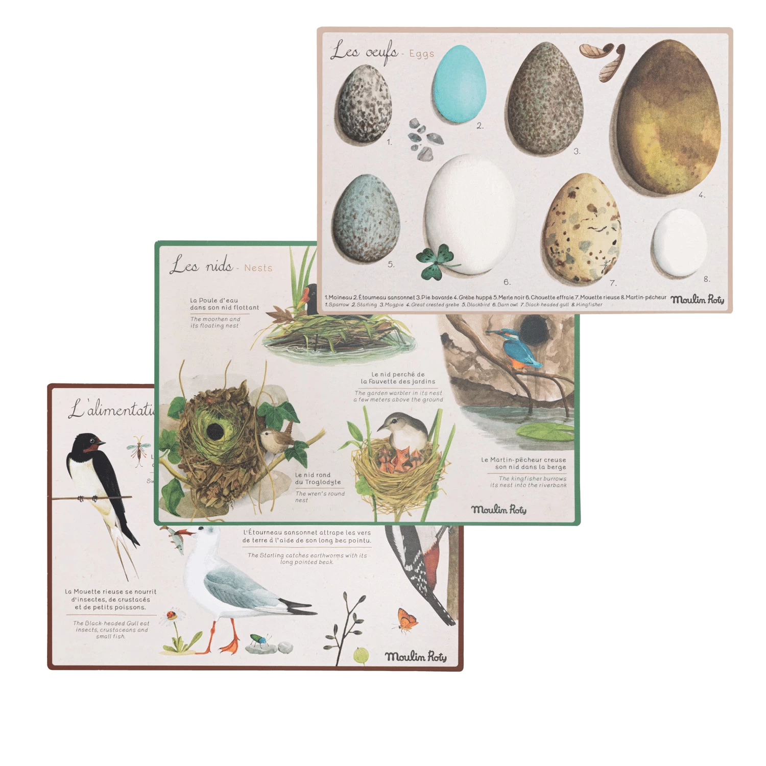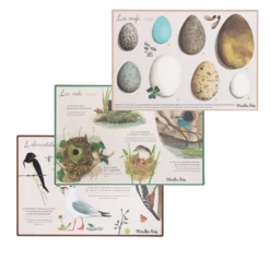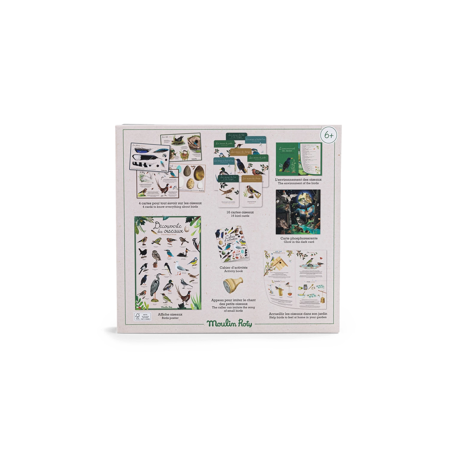 | Contenu du produit | 4 cartes (plumes, œufs, nids, alimentation), 16 portraits d'oiseaux, 1 appeau pour imiter les oiseaux, 1 carte nocturne phosphorescente, 1 cahier d'activités, 1 affiche, 1 notice, 1 dépliant sur l'environnement des oiseaux |