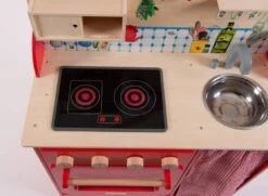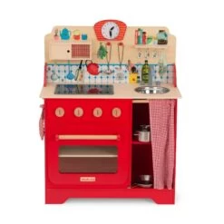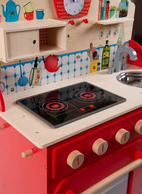 Chouette, une journée aux fourneaux avec la Grande Famille ! Cette cuisinière illustrée en bois comprend tous les accessoires pour préparer de bons petits plats : des ustensiles en métal, une manique vichy, et une plaque de cuisson sonore et lumineuse.