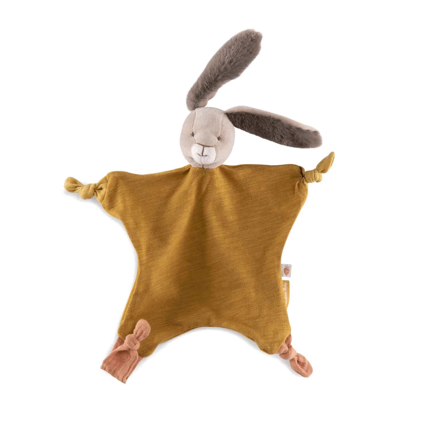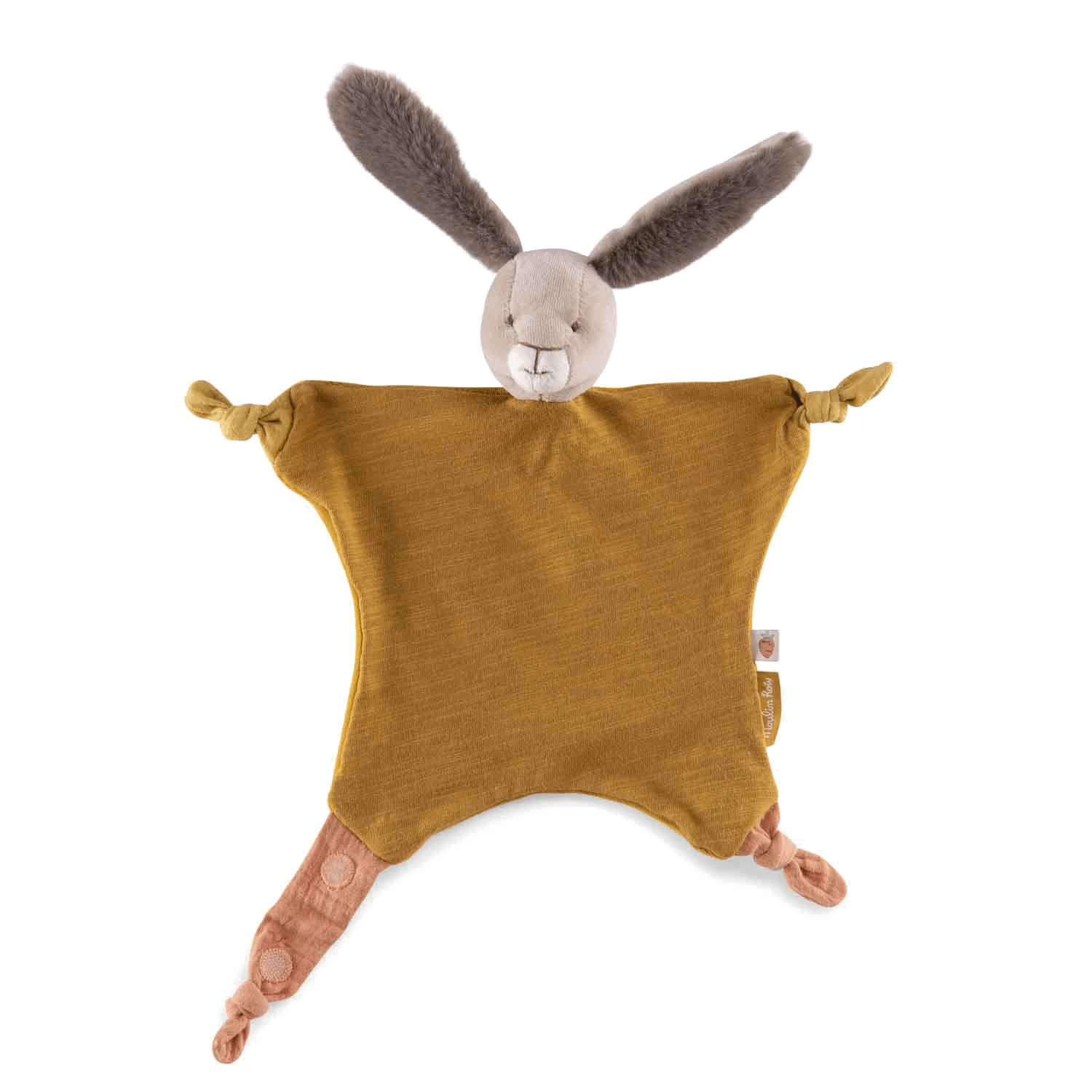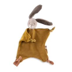 Doudou plat lapin ocre avec attache-tétine. Compagnon bi-matières réconfortant aux grandes oreilles toutes douces. Noué à chaque coin, il est facile à saisir par les petites mains et sera un allié précieux pour bébé. Peut être brodé au prénom de l’enfant.