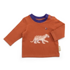 T-shirt manches longues brique en jersey de coton avec sérigraphie tigre. Intérieur gratté, finition carbone pour la douceur. Bord-côtes contrastés à l’encolure et boutons-pression à l’épaule.