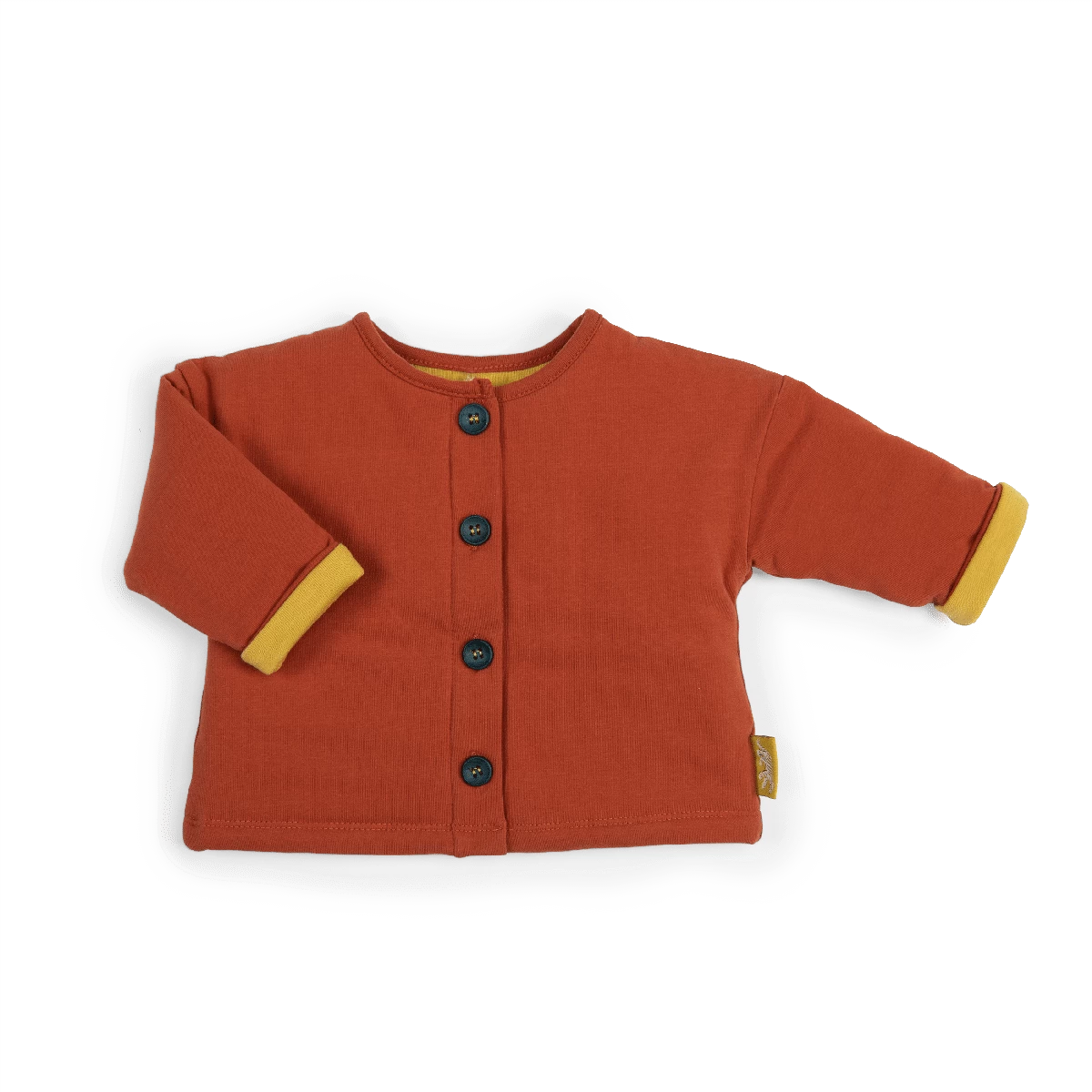 Gilet ouatiné couleur brique avec boutonnage bleu. Doublure et revers de manche curry en jersey flammé.