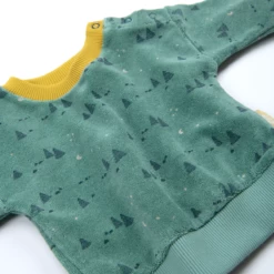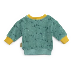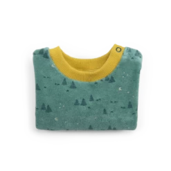 Sweat tout doux en éponge, imprimé Taïga. Bord-côtes curry à l’encolure et aux poignets et uni bas de sweat. Boutons-pression à épaules pour un habillage facile.