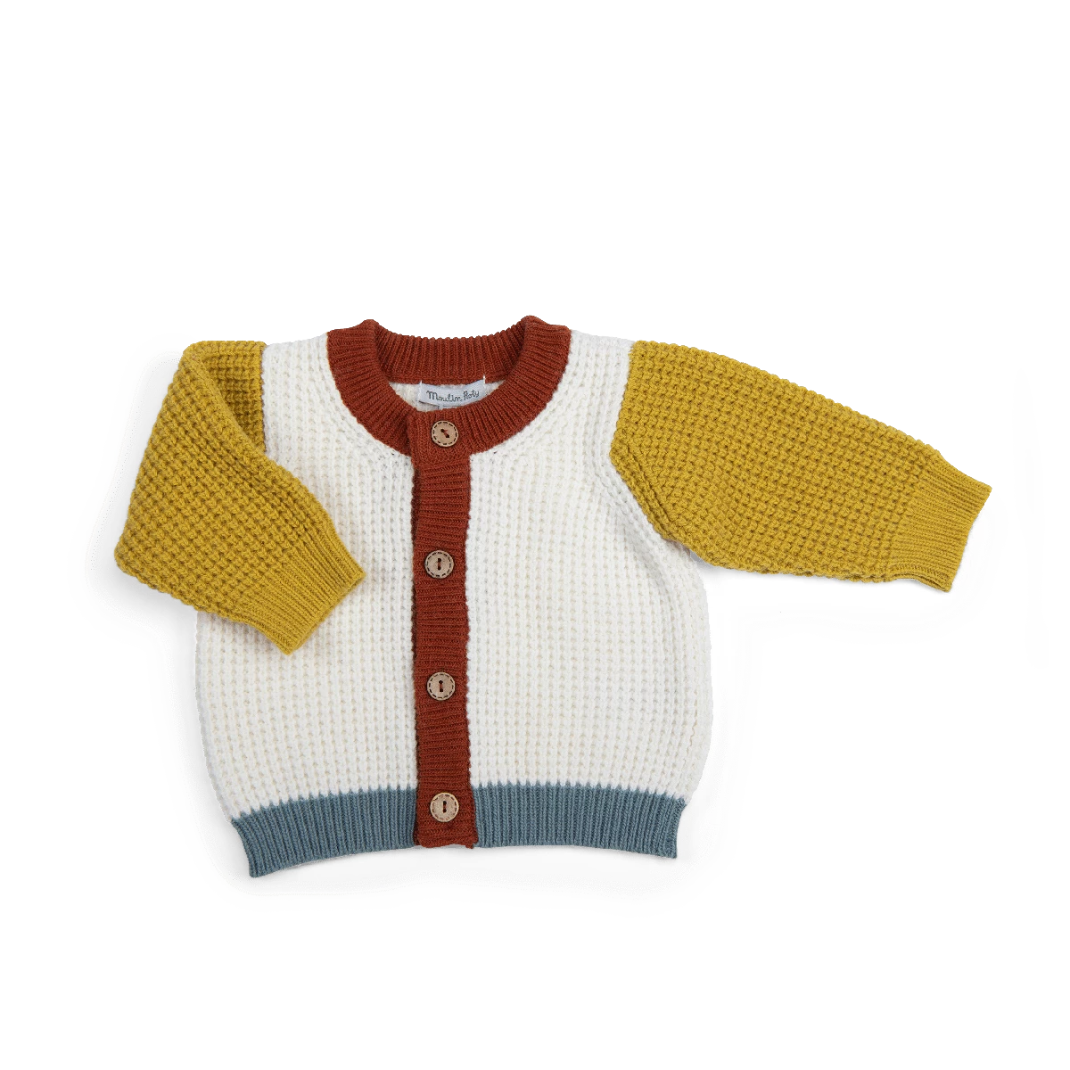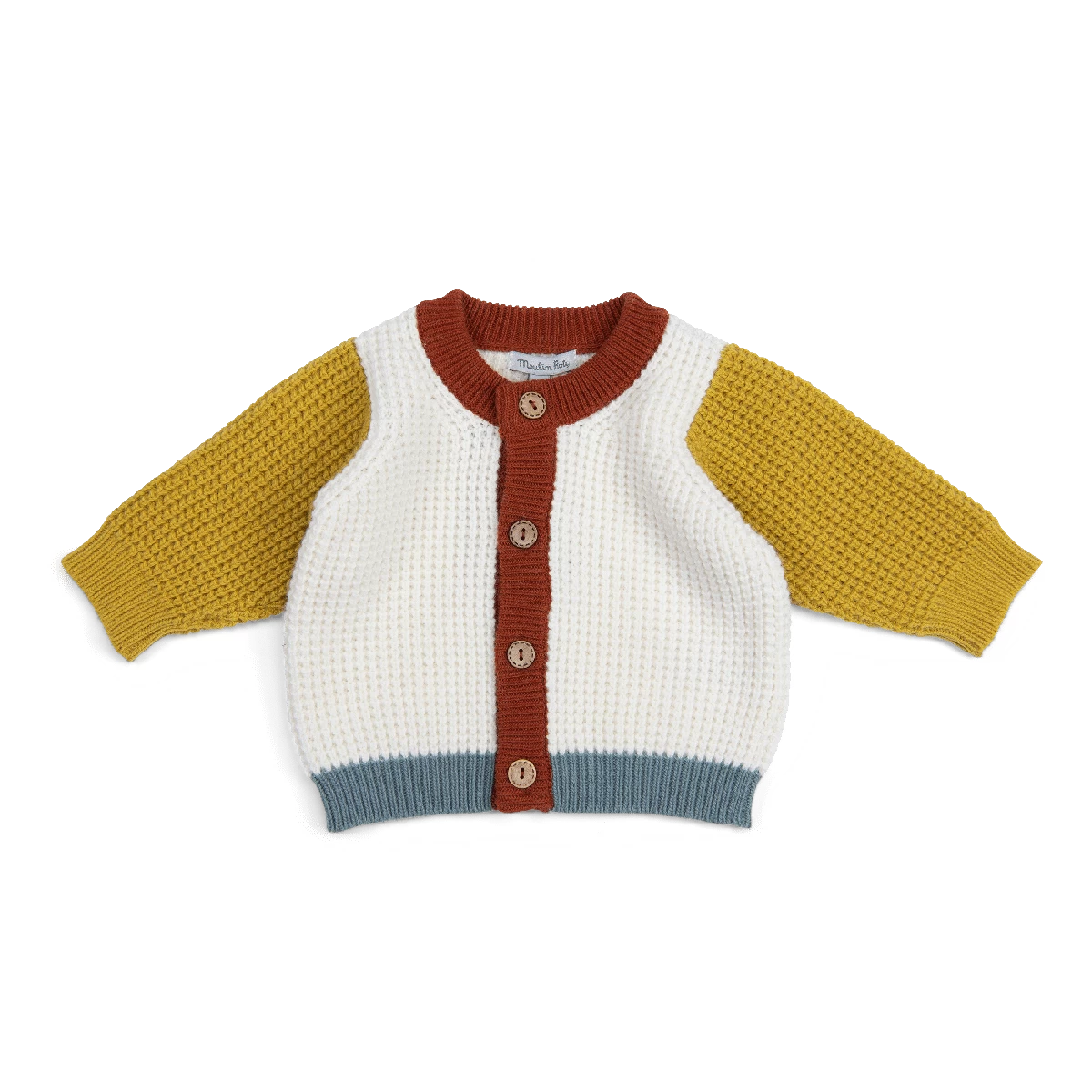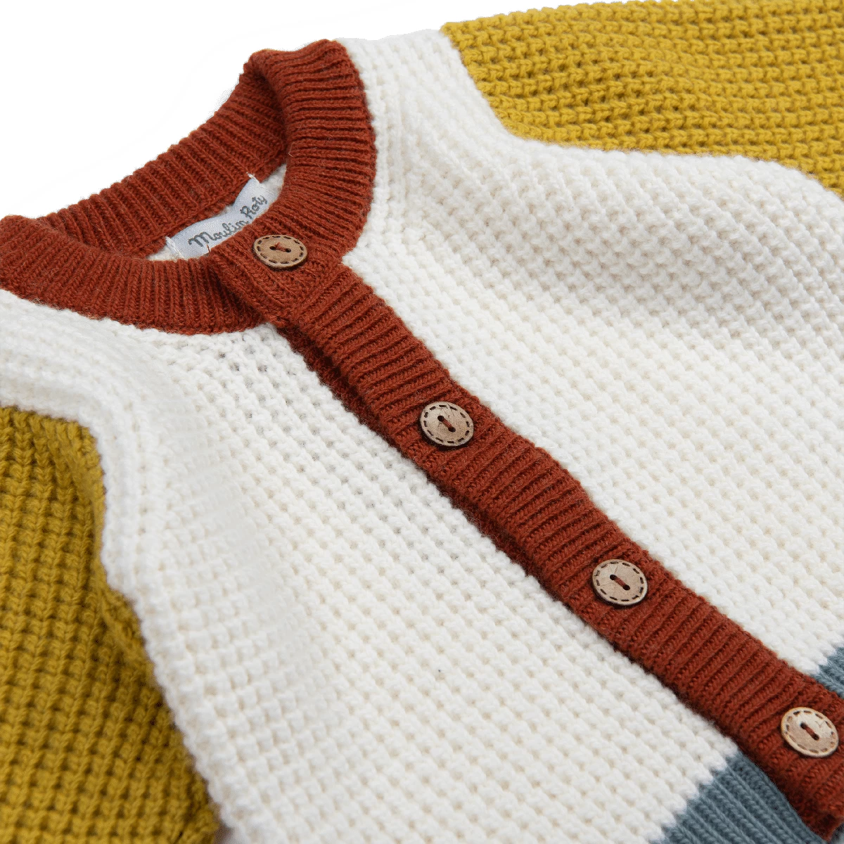 Cardigan trois couleurs à grosses mailles et boutons en bois. Composé de laine mérinos et cachemire, associés à du coton et viscose pour la douceur.
