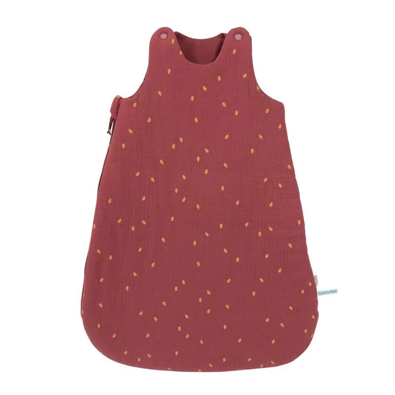Gigoteuse 0-6 mois (TOG 3) en matières naturelles : lange terracotta avec motif feuilles de chêne sur l’extérieur, et doublure en toile 100% coton pour laisser respirer la peau de bébé. Fermeture à glissière et boutons-pression pour un habillage facile.