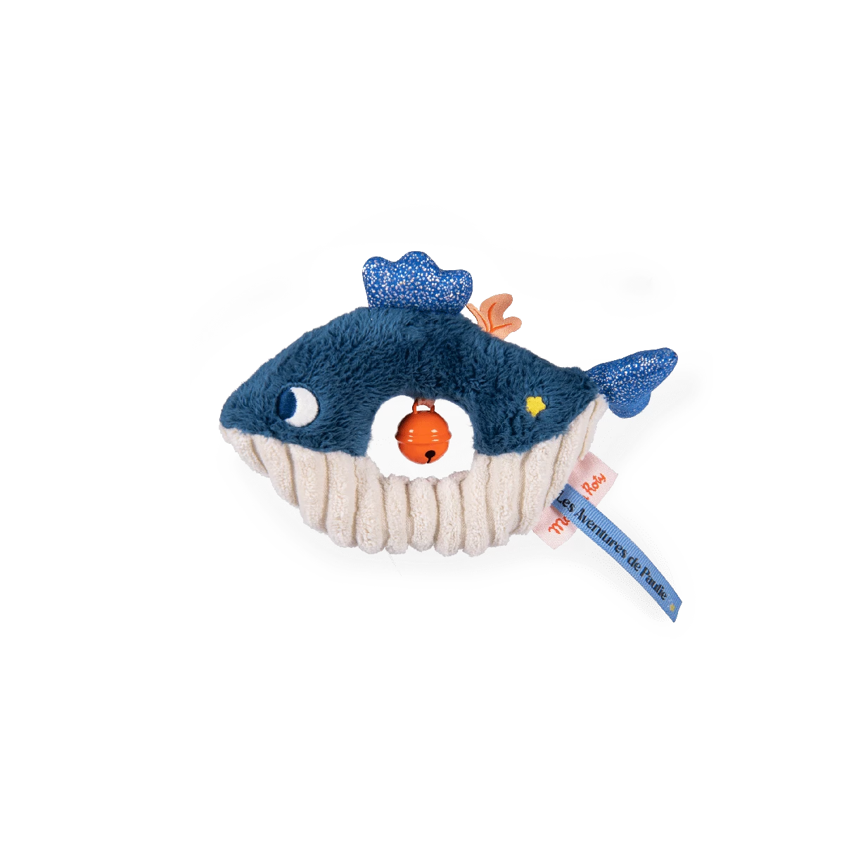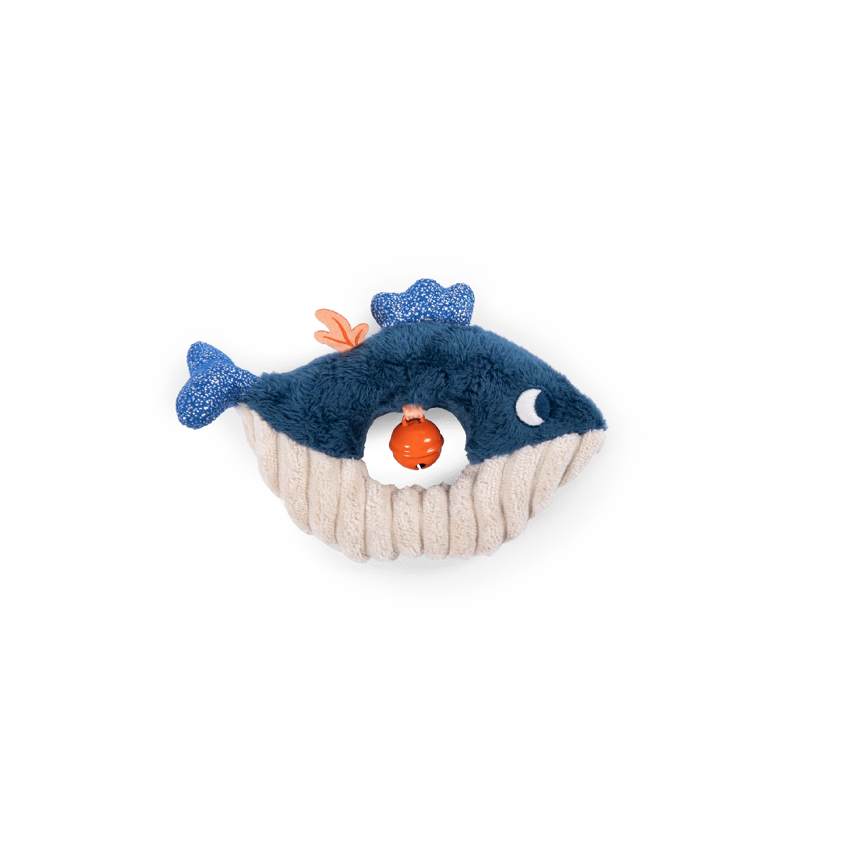 Une petite baleine que l’on entend tinter ! Cet anneau hochet facile à attraper est paré de trois tissus aux couleurs contrastées : tout doux, côtelé et pailleté. Le grelot couleur corail amusera bébé qu’il soit à la maison ou en promenade.