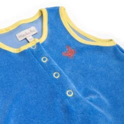 Combinaison bicolore en bouclette éponge avec print crabe sur le cœur. Pressions contrastées à l’entrejambe et sur le devant pour un habillage facilité.