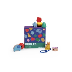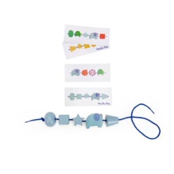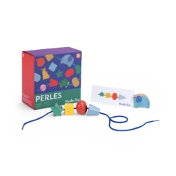 Jeu de manipulation et d’observation avec des perles de couleurs et formes variées à enfiler sur un lacet. L’enfant peut l’utiliser en jeu libre ou reproduire les séquences. Dès 18 mois