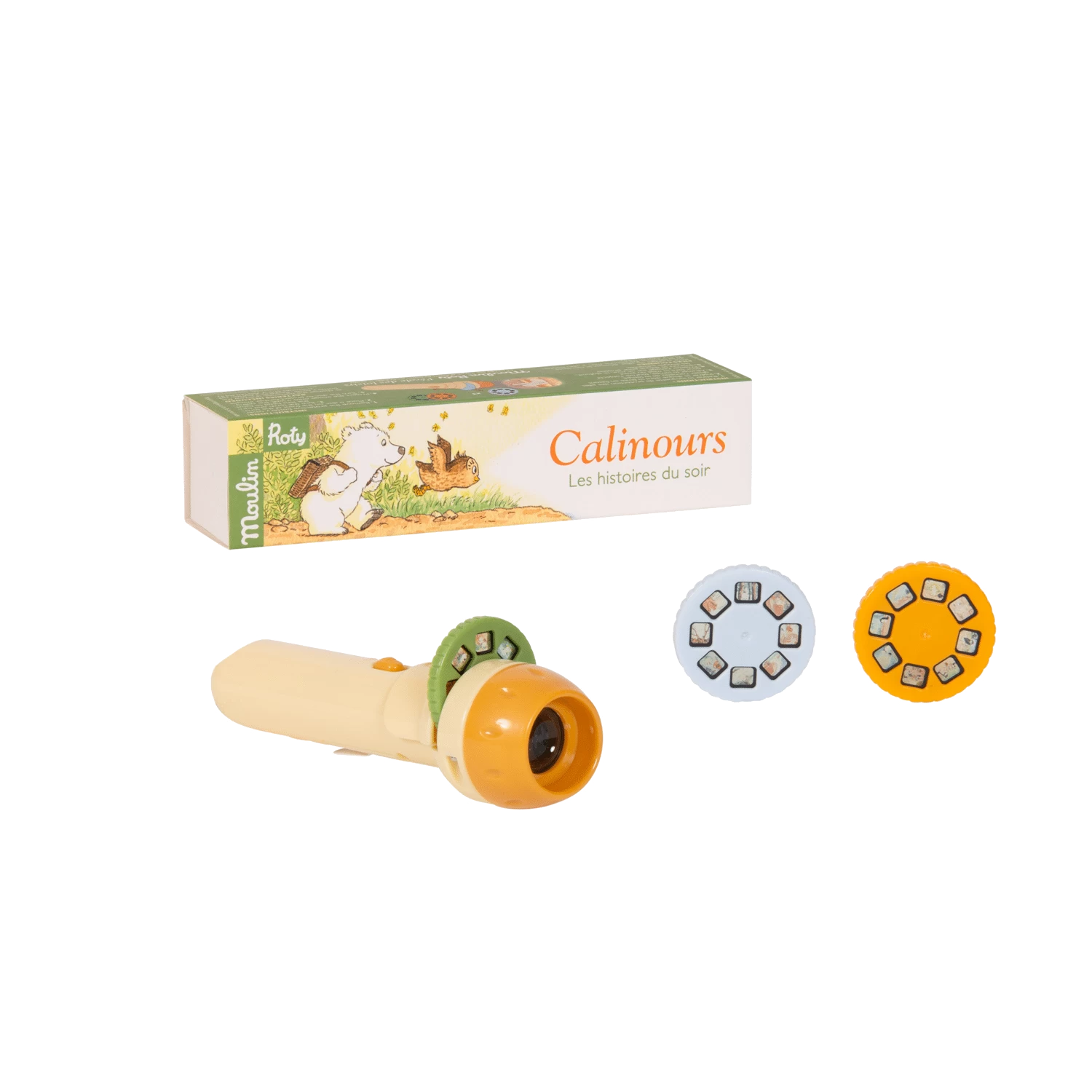 Lampe torche de poche où chacun des 3 disques projetés sur le mur raconte les aventures de Calinours, l’ourson mignon, héros de l’école des loisirs. Pour endormir les tout-petits et développer leur imagination !