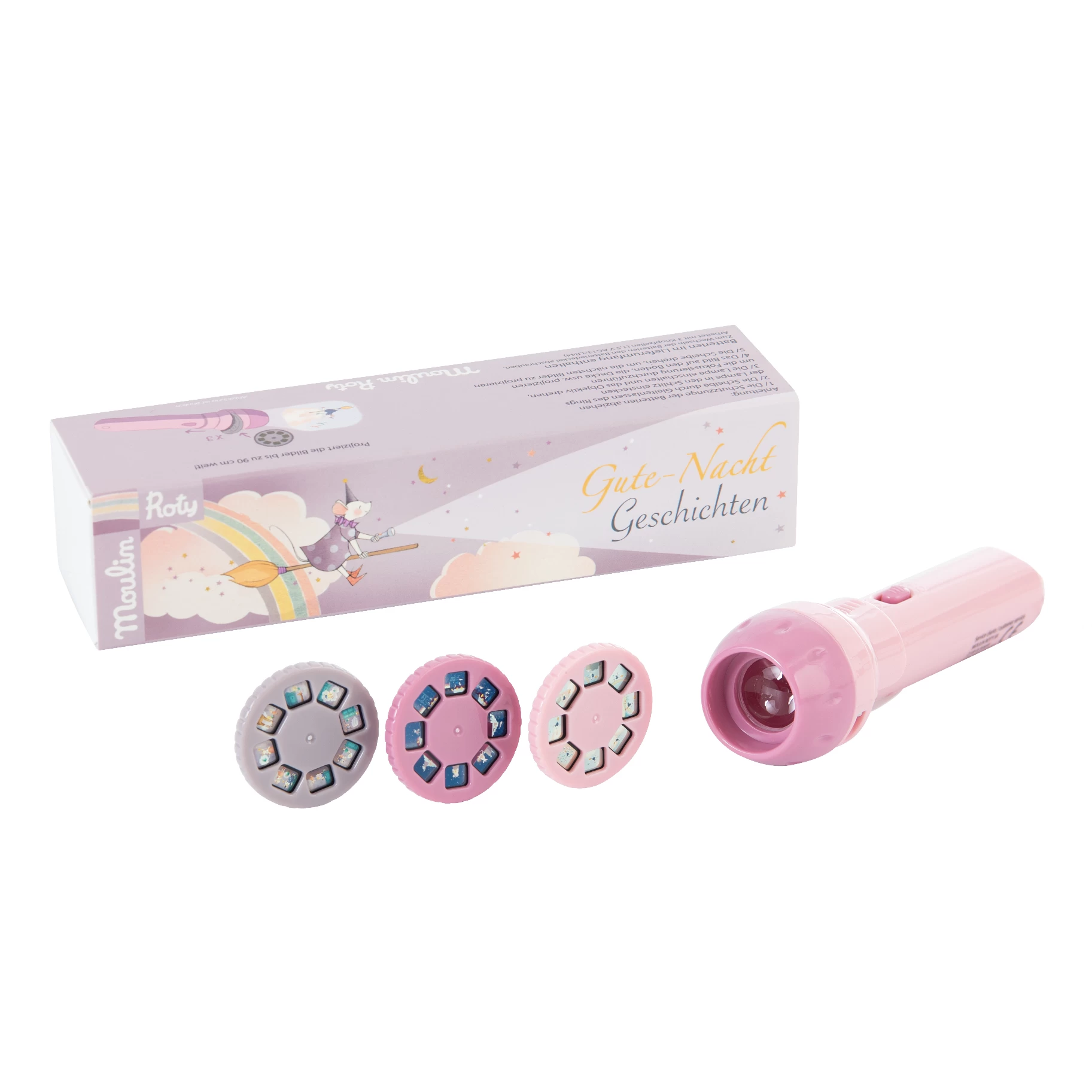 Découvrez la lampe à histoire rose “Il était une fois” ; trois histoires racontant les aventures des souris apprenties magiciennes : “La chasse aux étoiles”, “Promenade magique” et “L’apprentie sorcière”. Cette lampe est facile à utiliser : insérez un disque dans la lampe, allumez, les images se projettent sur un mur ou le plafond. Avec son doigt, on fait tourner le disque pour faire apparaître les images une par une tout en racontant l’image à votre enfant. En grandissant, votre bambin pourra à son tour raconter l’histoire tout en stimulant son imagination. Les piles sont fournies avec le produit. Retrouvez sur Jeujouet.com toutes les lampes à histoire de Moulin Roty.