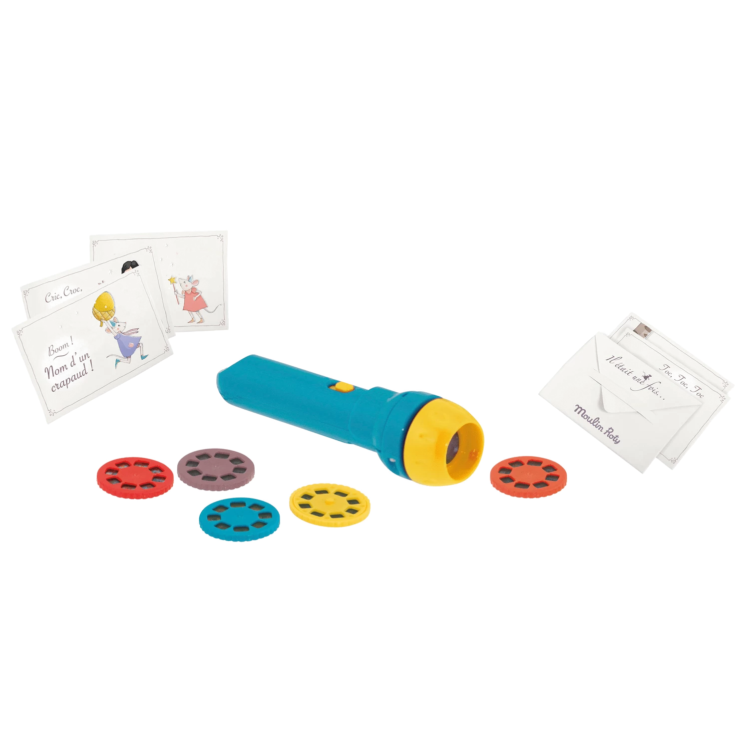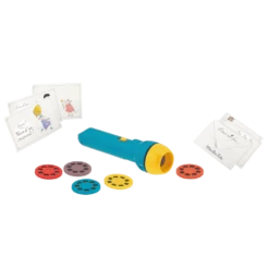 Ce joli coffret aimanté conçu comme un livre révèle une lampe à projeter avec 5 histoires de contes. Plongez dans 5 univers différents grâce à ce produit phare de Moulin Roty. Rien de plus simple pour la faire fonctionner : insérez un disque dans la lampe, allumez, les images se projettent sur un mur ou le plafond. Contient aussi des cartons d’invitation aux spectacles en forme de mini enveloppes avec des messages secrets. Votre enfant s’émerveillera devant tant de féérie et il stimulera ainsi son imagination. Chut, le spectacle va commencer. Idée cadeau originale pour un anniversaire. Dès 4 ans
