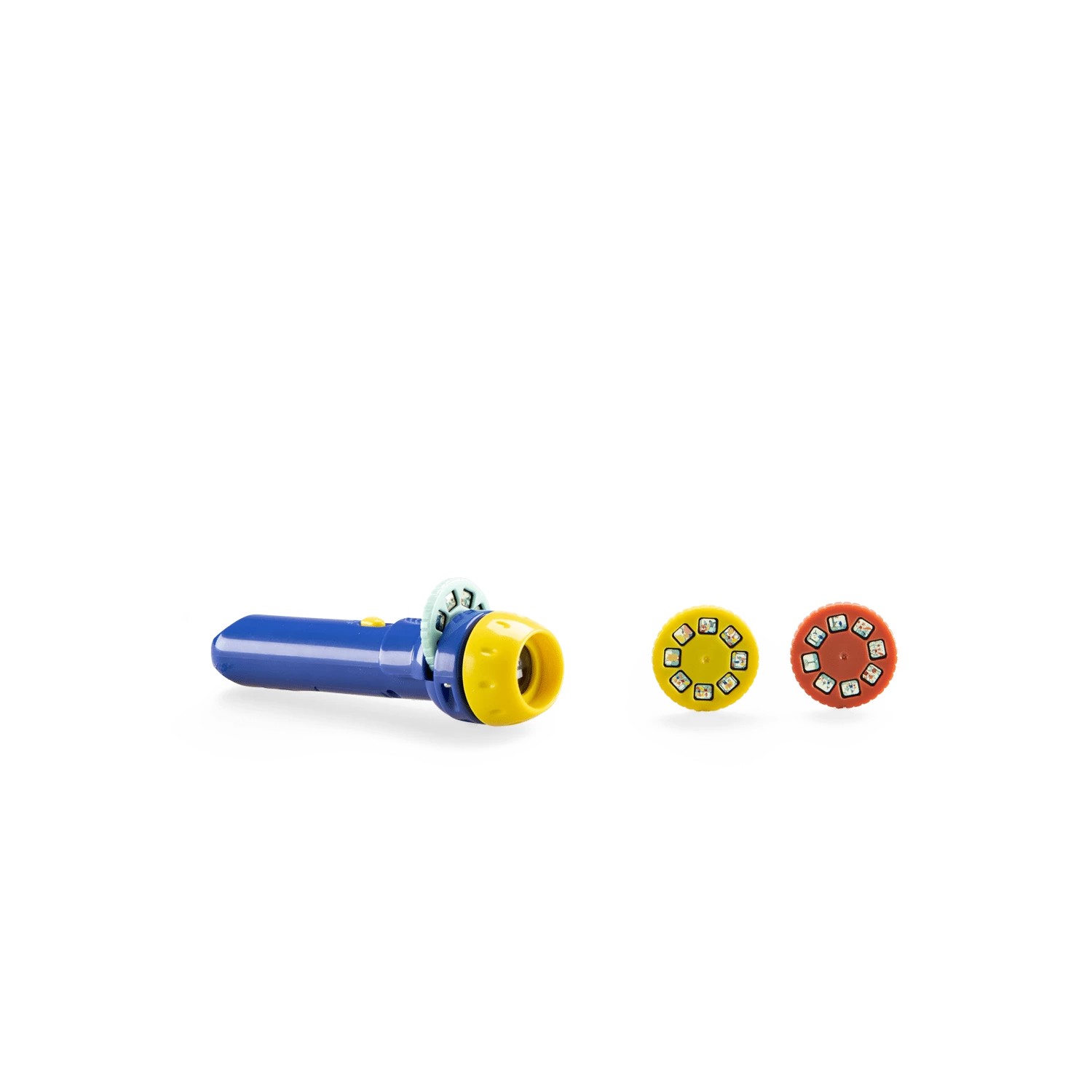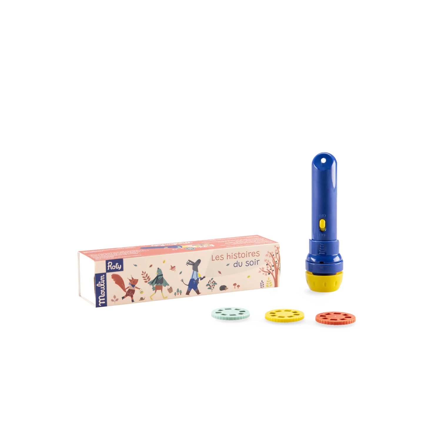 Lampe torche de poche où chacun des 3 disques projetés sur le mur raconte une histoire en couleur sans paroles des personnages de la collection Pomme des Bois. Un instant magique pour développer l’imagination des enfants.