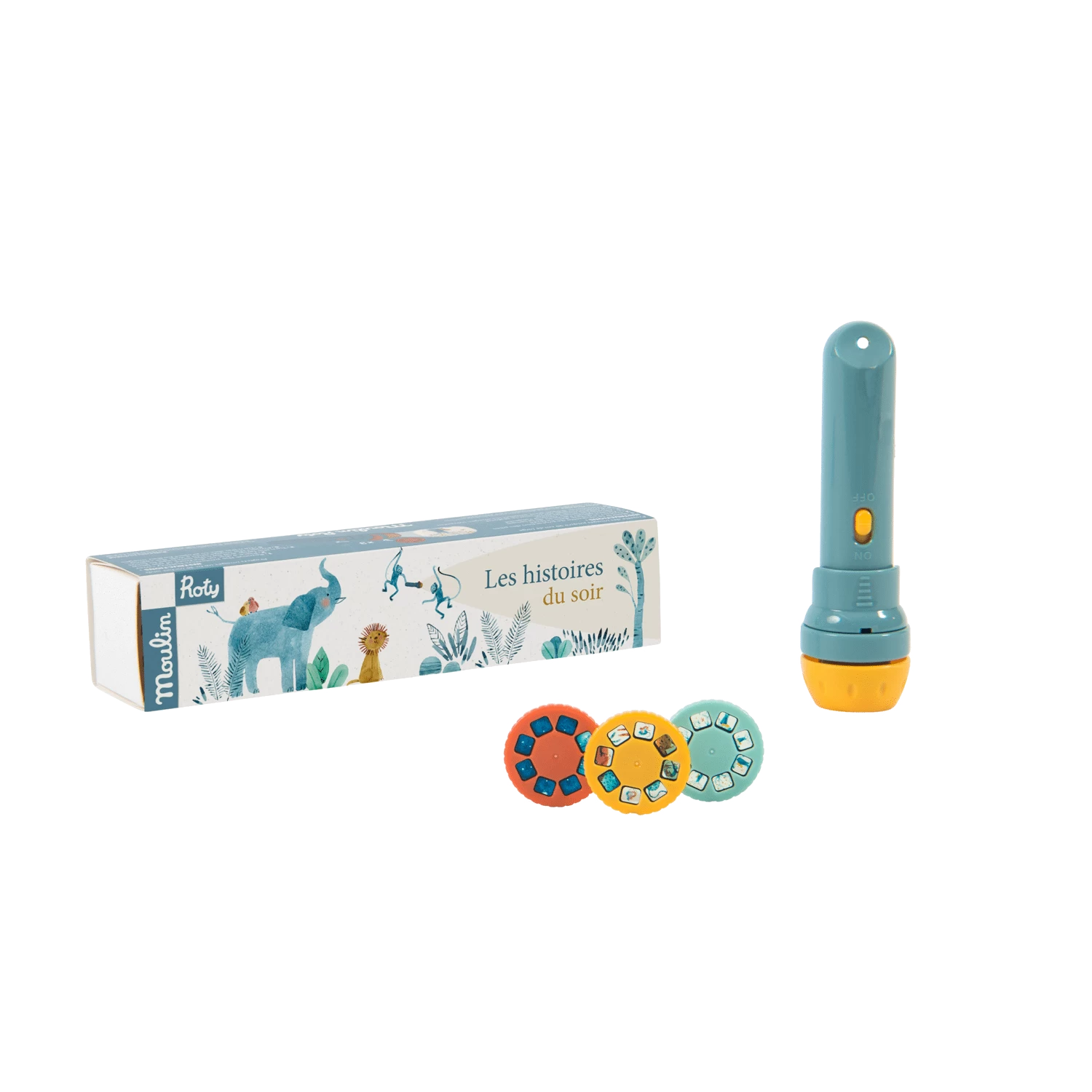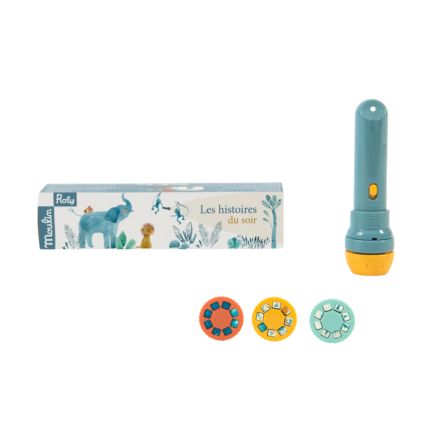Lampe torche de poche où chacun des 3 disques projetés sur le mur raconte une histoire. Elles racontent les aventures douces et joueuses des animaux de Sous mon baobab. Un instant magique pour développer l’imagination des enfants…