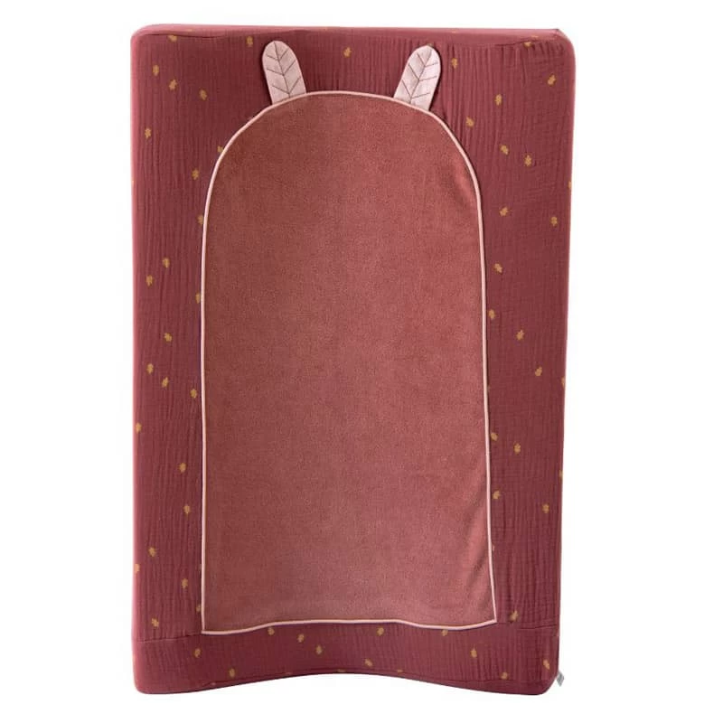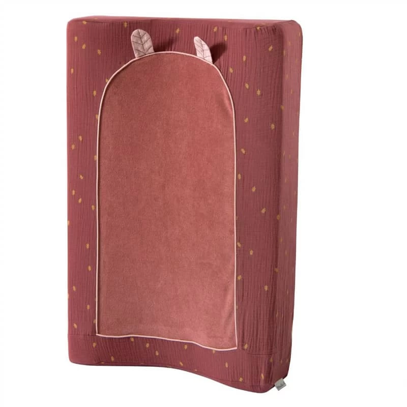 Matelas à langer avec housse amovible et lavable, en lange et tissu éponge. Jeux de matières et jolies couleurs rose et terracotta sont réunis pour accueillir bébé dans la douceur. Deux oreilles en lin rappellent l’univers tendre d’Après la pluie…