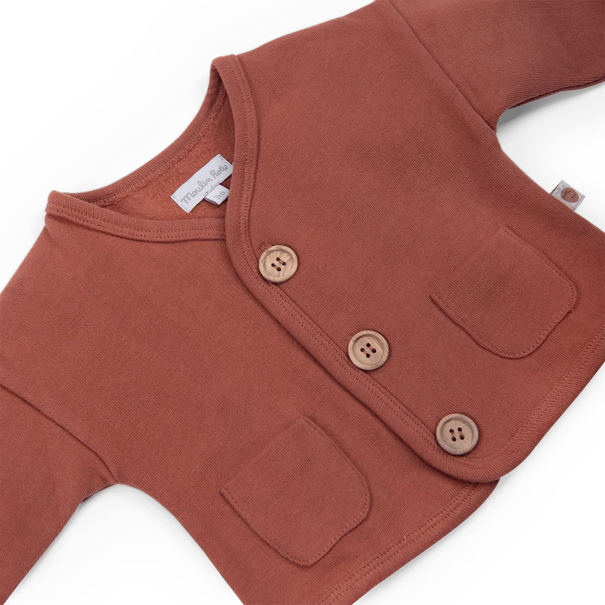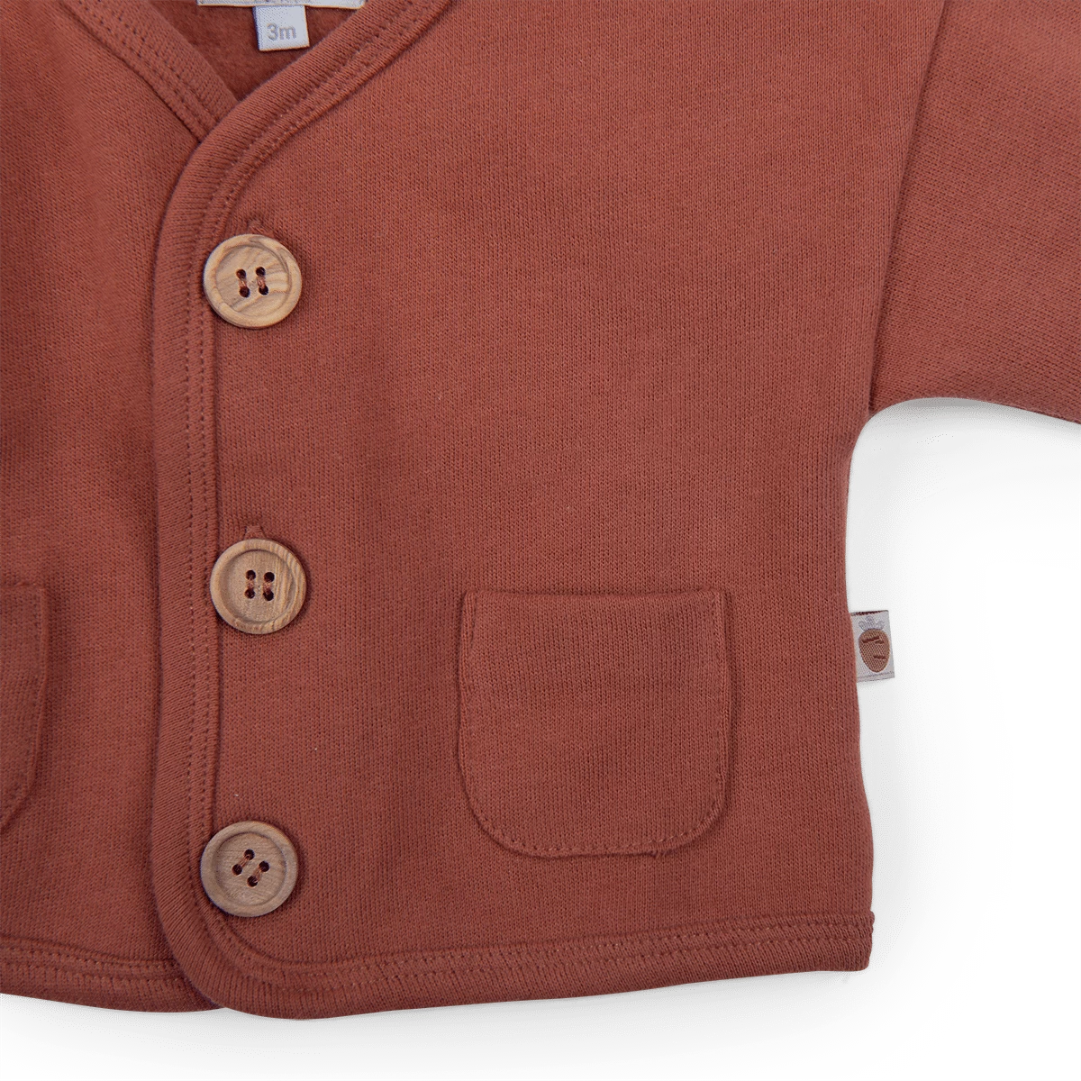 Cardigan cannelle en molleton doux, ouverture sur le devant par boutons bois et petites poches plaquées.