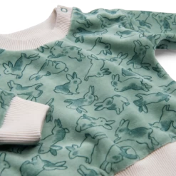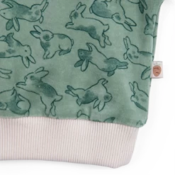 Sweat en velours tout doux, imprimé lapins. Bords-côtes et boutons-pression à l’épaule.
