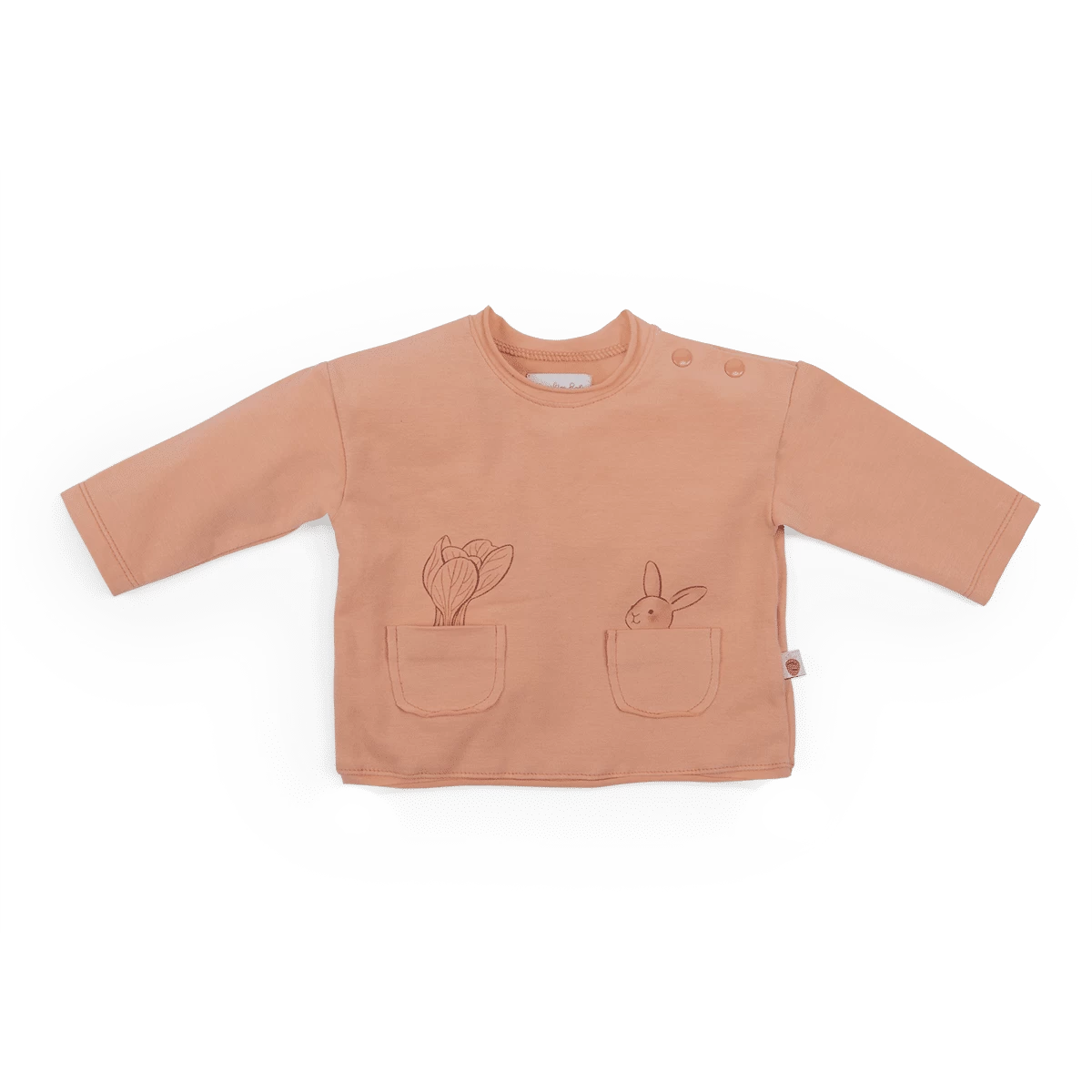 T-shirt noisette en jersey flammé. Poches plaquées avec imprimés chou et lapin. Roulotté à la taille et à l’encolure pour la finition.