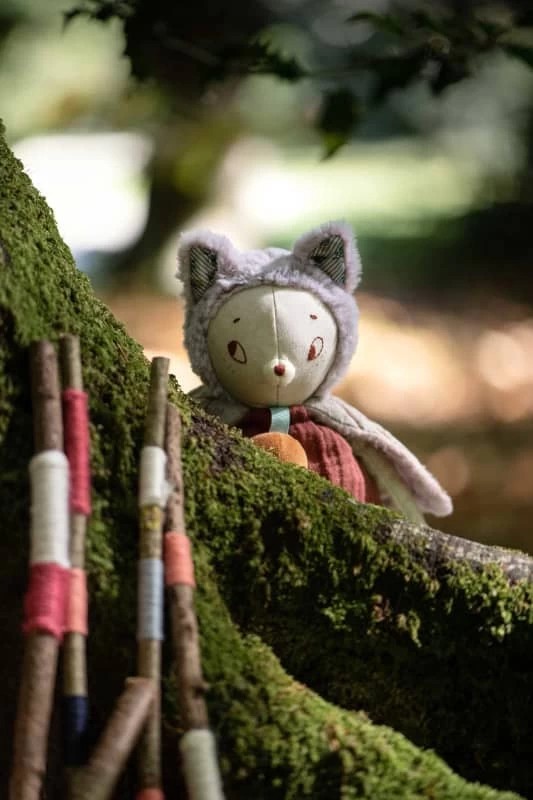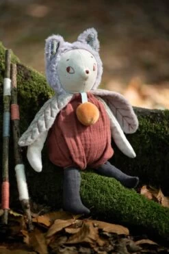Partons à la rencontre de Giboulée, adorable petit chat issu de la toute nouvelle collection Après la Pluie de Moulin Roty, imaginée par Lucille Michieli. A la fois tendre et poétique, cette gamme nous emmène faire la rencontre de jolies petites peluches aux grands yeux, tout droit sorties de leurs sous-bois et prêtes à se faufiler sous les draps ou dans les tiroirs. Découvrez Giboulée, jolie peluche de 30 cm représentant un chat tout mignon au look super tendance . Elle accompagnera votre enfant pour de tendres moments câlins et le réconfortera avant d’aller se coucher. Giboulée porte une salopette en tissu lange coton bio prune ainsi qu’un grelot autour du cou. Ses épaules sont délicatement recouvertes par deux feuilles en tissu chambray gris et polaire rose. Bébé appréciera le toucher tout doux de la fourrure parme présente sur la tête de ce charmant doudou. Un premier compagnon idéal pour votre petit qui lui apportera douceur et rêverie. Idée cadeau de naissance original. Matière(s) : Lange coton bio, polyester. Pas de sèche-linge. Dès la naissance.