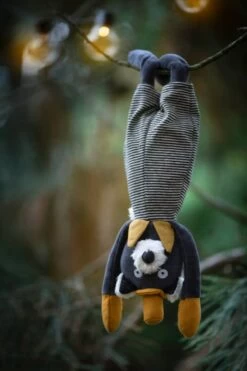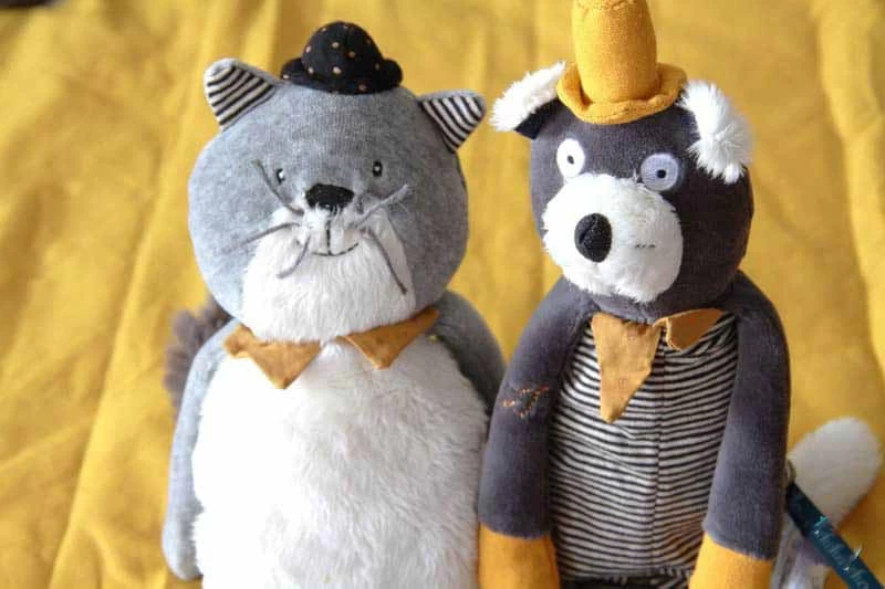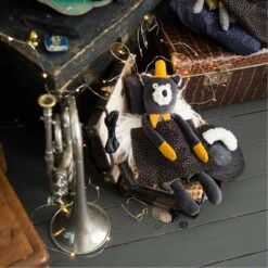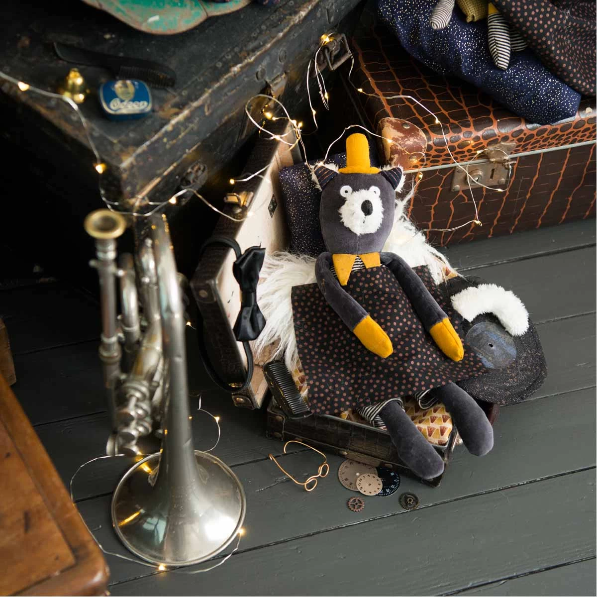 Voici Les Moustaches de chez Moulin Roty : une joyeuse bande de chats musiciens . Cette peluche de 39 cm, c’est Alphonse, on le reconnait à son chapeau haut de forme jaune moutarde et son nœud papillon assorti. Son pelage est gris foncé et il porte un ensemble à rayures. Ce matou est facile à attraper par les bras et les jambes; il sera le compagnon idéal pour jouer, créer des histoires et même pour faire des câlins. Ne pas mettre au sèche-linge. Dès la naissance.