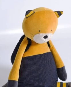 Voici Les Moustaches de chez Moulin Roty : une joyeuse bande de chats musiciens . Cette grande peluche de Lulu mesure 59 cm de haut ce qui lui permet de faire des gros câlins. Ce matou au pelage jaune moutarde porte une salopette à rayures cuivrées et des chaussettes rayées. Sur son dos se trouve un sac à dos, votre enfant pourra y ranger ses trésors ou son pyjama. Son style aux formes rondes et ses couleurs originales feront de lui un bon élément de décoration dans la chambre de votre enfant. Cette peluche sera vite adoptée par votre enfant et trouvera rapidement sa place dans sa chambre. Un cadeau d’anniversaire original. Ne pas mettre au sèche-linge. Dès la naissance.