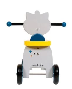 Ce beau porteur en bois représente Fernand de la fameuse bande de chats musiciens Les Moustaches. Ce matou gris possède 4 roues bleues étoilées silencieuses et deux grandes poignées pour bien se tenir. A partir de 12 mois et dès que bébé arrive à enjamber, il sera enchanté de se balader dans la maison en poussant sur ses jambes. Cela renforcera la musculature de ses jambes et la coordination de ses mouvements et l’aidera à l’apprentissage de la marche. Il y a une butée de braquage du guidon pour éviter les chutes. Ce porteur fera un ravissant cadeau pour un premier anniversaire.