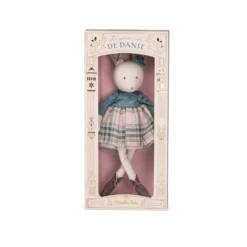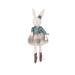 Poupée lapin en chambray au doux visage brodé, Victorine, d’une grande élégance est vêtue de sa robe à carreaux et de son tulle pailleté. Facile à attraper par les petites mains, elle deviendra le compagnon de jeu privilégié des petits danseurs en herbe.