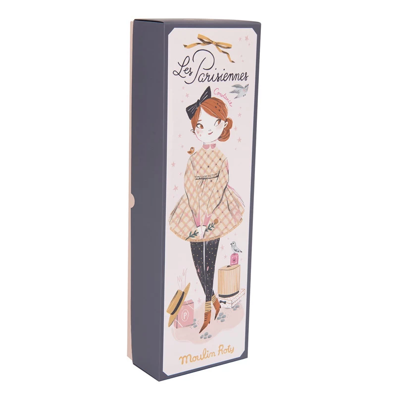 Ravissante dans sa robe à motif, col Claudine, volant pailleté, noeud de mousseline, voici Madame Constance la Parisienne par excellence. Cette grande poupée des Parisiennes Moulin Roty aux yeux marrons et aux chignons sur le côté se présente dans un joli coffret cadeau, illustré par la créatrice Lucille Michieli.