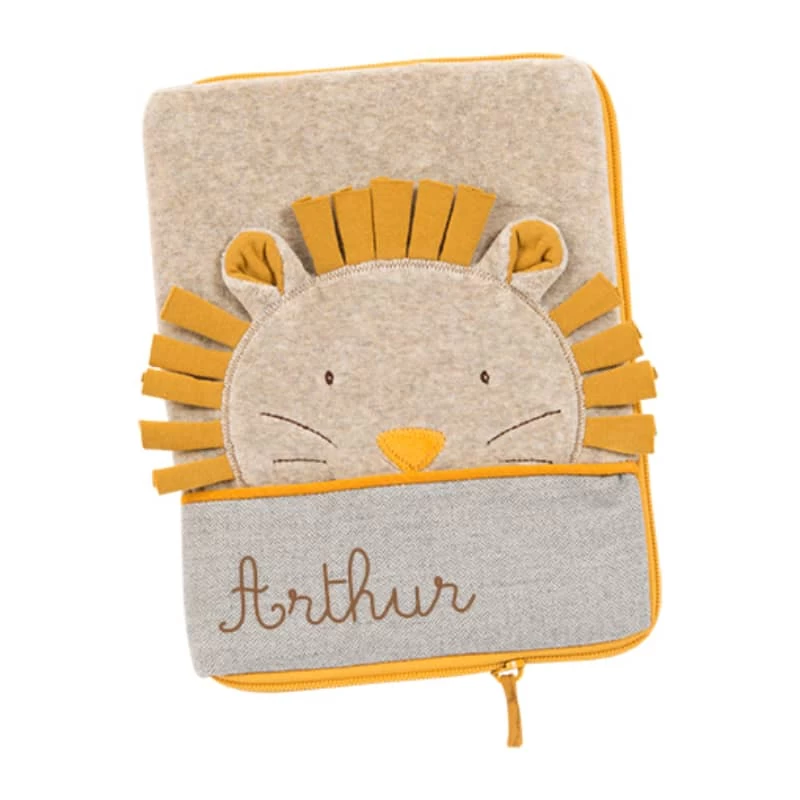 Pochette de protection pour carnet de santé, zippée, en velours chiné et tissu chevron. Le lion à la crinière dorée trône sur la couverture, tel le soleil de la savane ! Peut être brodé au prénom de l’enfant, idéal pour un cadeau naissance.