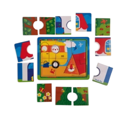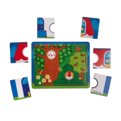 Puzzle en bois. 6 pcs sur 3 niveaux successifs. Chaque puzzle est associé à une couleur pour faciliter l’apprentissage. Les pièces sont faciles à attraper grâce aux fenêtres. Chaque niveau révèle une histoire dans un nouveau décor Les Popipop. 2 ans et +