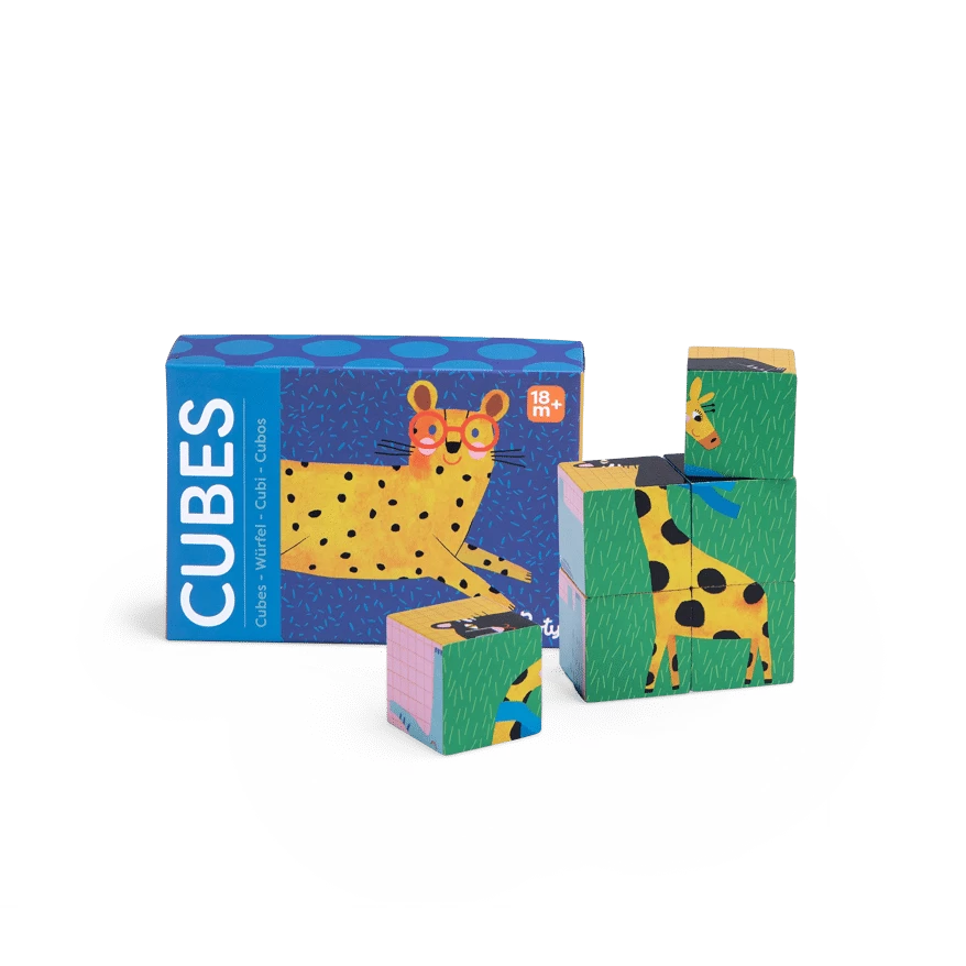 Jeu d’éveil 2 en 1 pour les tout-petits, à la fois puzzle et jeu de construction. Tournez les faces illustrées des 6 cubes pour reconstituer les drôles de portraits des animaux de la collection Les Toupitis. Cubes en bois facile à manier. Dès 18 mois