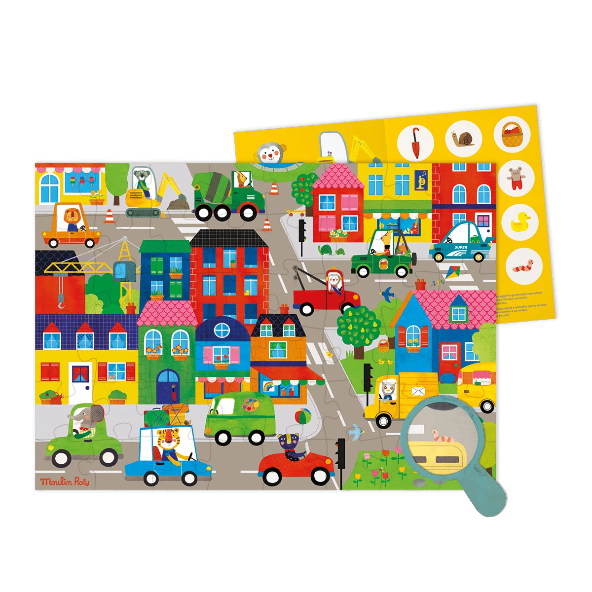 Puzzle d’observation 48 pcs. En ville + 1 poster. collection Les Popipop. Une fois assemblé. à l’aide d’une loupe. amuse-toi à retrouver véhicules. objets et petits animaux cachés dans l’illustration. 4 ans et +