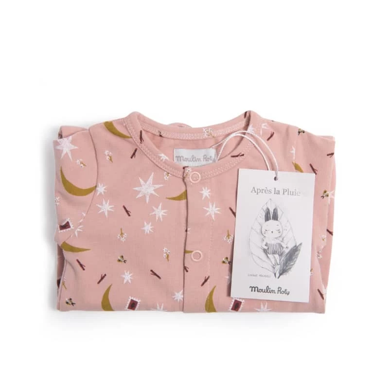 Pyjama en jersey de coton rose à motifs étoilés, avec ouverture en Y par boutons-pression sur le devant et encolure en rond. Il enveloppera bébé de douceur pour toute la nuit.