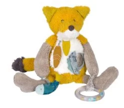 Grâce à cette douce peluche d’activités en forme de renard, votre enfant s’émerveillera aux différents sons qui l’entoure et ses sens seront stimulés. Très complet, ce jouet d’éveil est un compagnon parfait pour bébé qui s’amusera avec les divers accessoires qui le composent : anneau à billes, petit miroir pour découvrir son reflet et s’admirer, pouët pouët dans le bout de sa queue, papier crissant dans les plumes de son collier et bruit de hochet dans son petit poisson bleu. Son toucher tout doux et sa bouille attendrissante rendent cette peluche renard encore plus mignonne . Ce renard possède une fourrure bouclette couleur moutarde, un ventre blanc tout doux et dans ses oreilles, nous retrouvons un tissu en lin jaune brodé. Adapté aux petites mains, bébé l’agrippera aisément par les pattes et il le câlinera avec affection. Idée cadeau pour une naissance.