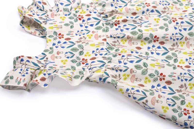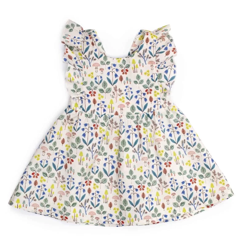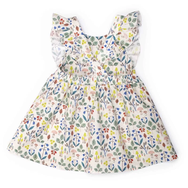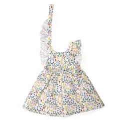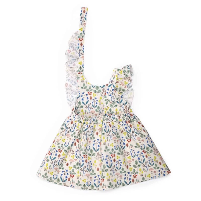 Robe trapèze avec fronces, en toile 100% coton bio, et son motif floral all over. Petits plis sur les épaules et bretelles réglables avec boutons, croisées au dos.