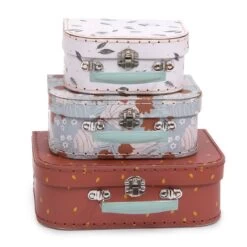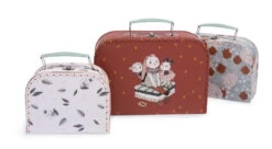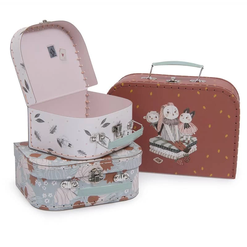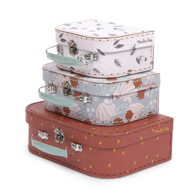 Set de 3 valises déco de formats différents, en carton avec finition cousue, poignée et ouverture métal. Illustrées de l’univers délicat d’Après la pluie, elles permettront de ranger et transporter tous les personnages et trésors de la collection !