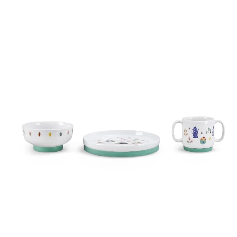 Coffret vaisselle en porcelaine, tendrement illustré pour manger comme les grands. Comprend bol, tasse à anses et assiette avec chaussette antidérapante en silicone amovible qui adhère sur les surfaces lisses et empêche de glisser ! Passe au lave-vaisselle