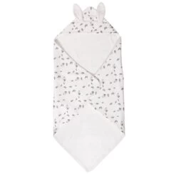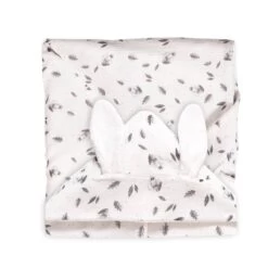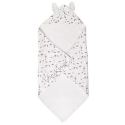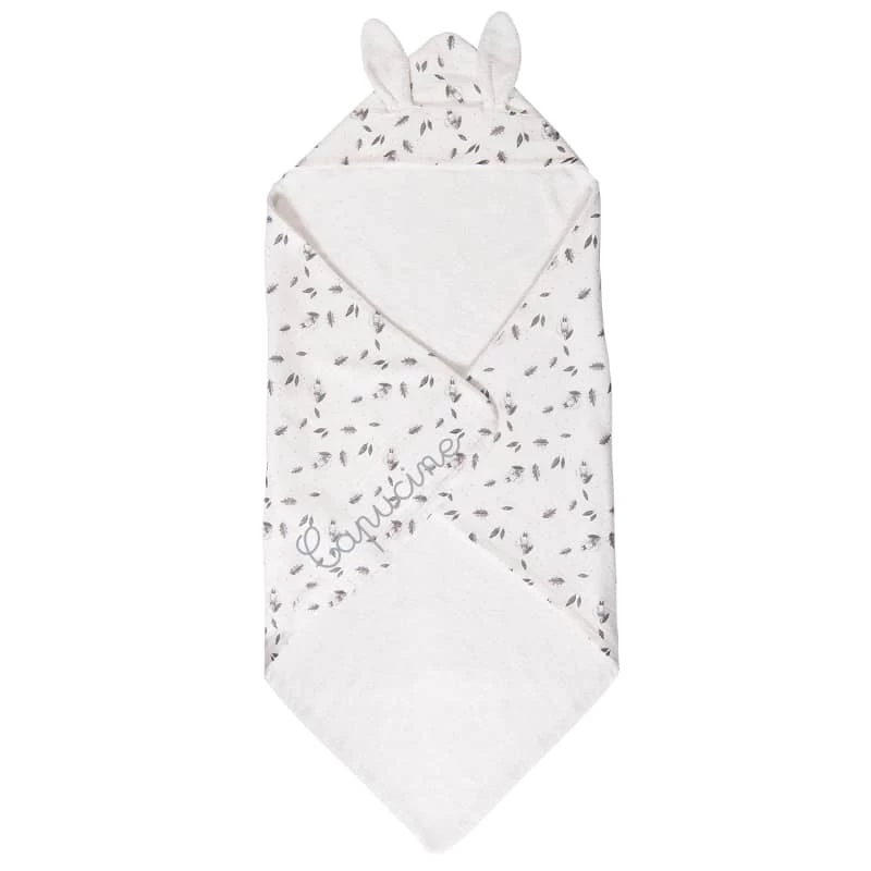 Cape de sortie de bain 100% coton en matière éponge bouclette et lange à motifs. La capuche est surmontée de deux adorables oreilles de lapin. Elle peut être brodée au prénom de l’enfant, idéal pour un cadeau naissance !