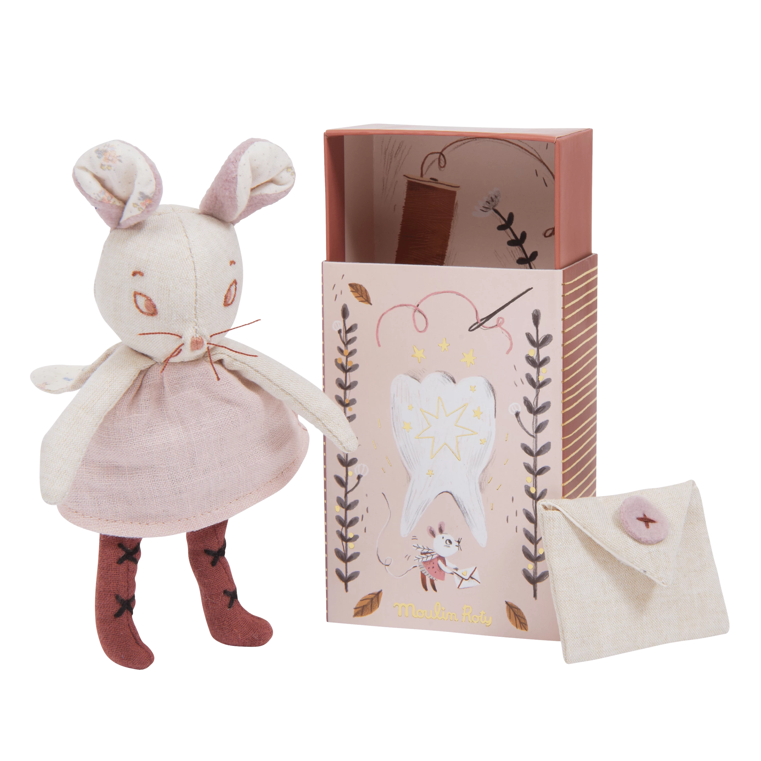 La petite souris fée de la collection Après la pluie de Moulin Roty tient dans sa main une enveloppe à scratch avec intérieur fleuri, pour ranger les dents de lait des enfants ! Elle est vêtue d’une robe en lin avec des ailes dans le dos, son minois est brodé et ses oreilles sont en velours tout doux.