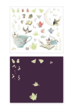 Plongez votre enfant dans un univers féerique grâce à ces stickers repositionnables.74 stickers déco représentant les personnages de la collection : le hibou magicien, les souris magiciennes et leurs accessoires : la vaisselle animée, les grimoires, l’horloge magique et tout plein d’étoiles. Certains stickers brillent dans le noir pour émerveiller votre petit. Super idée pour décorer la chambre.