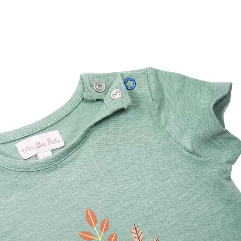 T-shirt vert sauge souple et agréable à porter, en jersey de coton flammé avec sérigraphie hérisson. Boutons-pression contrastés à l’épaule pour un habillage facile.