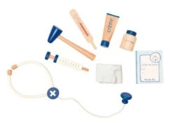 Dès 3 ans. Matières: valise en carton, instruments en bois, bandage en tissu et carnet en papier.
