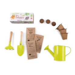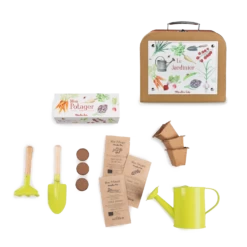 Pour jouer au petit jardinier et regarder pousser son potager. Valise en carton illustrée contenant : un arrosoir, une pelle, un râteau en bois et métal et trois pots miniatures en matière végétale et biodégradable avec graines de légumes à planter (tomates, radis et carottes). Dès 6 ans.
